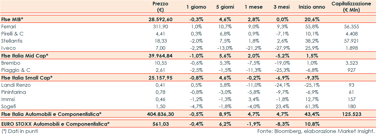 Ieri il Ftse Italia Automobili e Componentistica ha riportato un -0,5% rispetto al -0,4% del corrispondente europeo e al -0,3% del Ftse Mib.