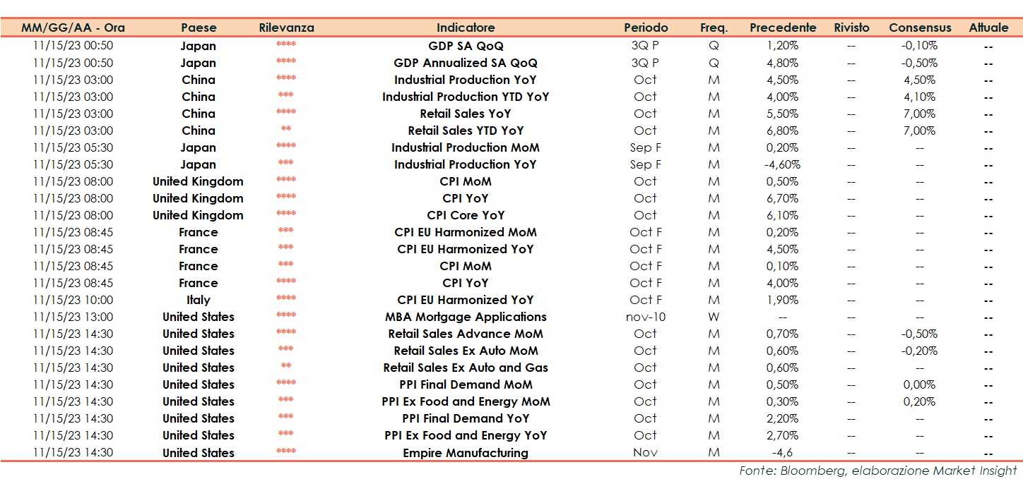 Ore 14:30 Usa: Vendite al dettaglio, ottobre; Prezzi alla produzione, ottobre; Indice manifatturiero New York Empire State, novembre.