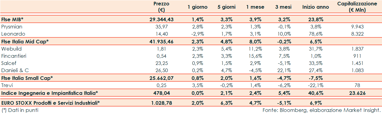 Ieri il Ftse Italia Ingegneria e Impiantistica ha riportato una performance stabile rispetto al +2,0% del corrispondente europeo e al +1,4% del Ftse Mib.