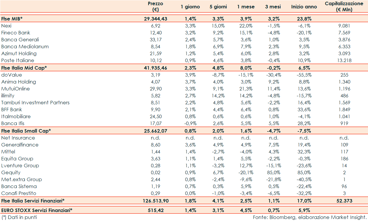 Ieri il Ftse Italia Servizi Finanziari ha riportato un +1,8% rispetto al +1,4% del corrispondente europeo e del Ftse Mib.