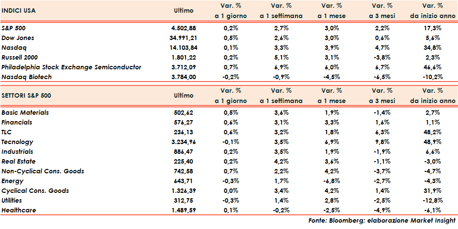 I quattro indici principali rallentano il passo nel finale, ma chiudono tutti in verde con il seguente esito: Nasdaq +0,1%, Russell 2000 e S&P500 +0,2% e Dow Jones + 0,5%.