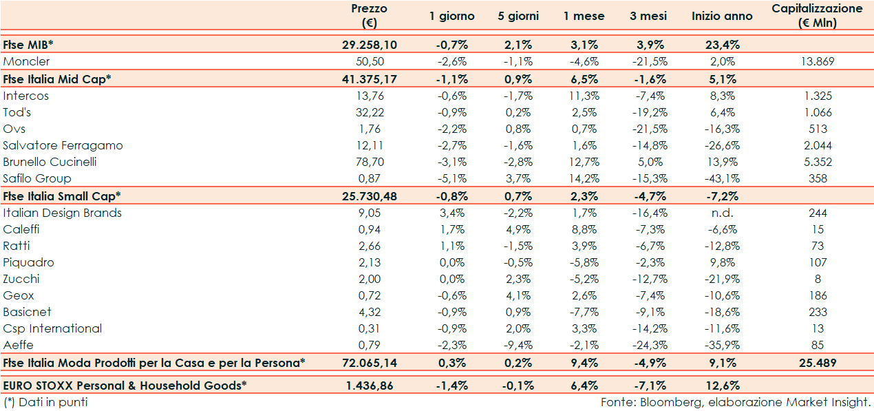 Infine, tra le Small, Italian Design Brands (+3,4%) e Caleffi (+1,7%) hanno sovraperformato le altre mentre Aeffe (-2,3%) è stata la peggiore.