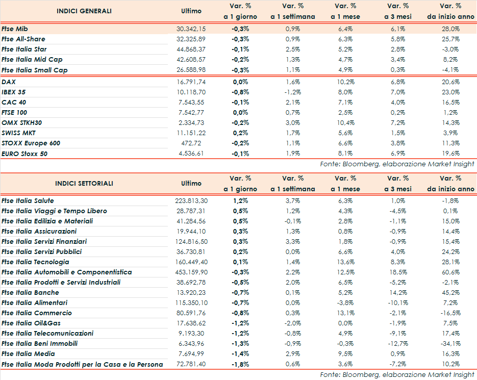 A Milano, il Ftse Mib archivia gli scambi con un –0,3% a 30.342 punti, debole come il Cac 40 di Parigi (-0,1%), mentre l’Ibex 35 di Madrid chiude con un -0,8%. Sostanzialmente invariati il Dax di Francoforte (0,0%) e il Ftse 100 di Londra (0,0%).