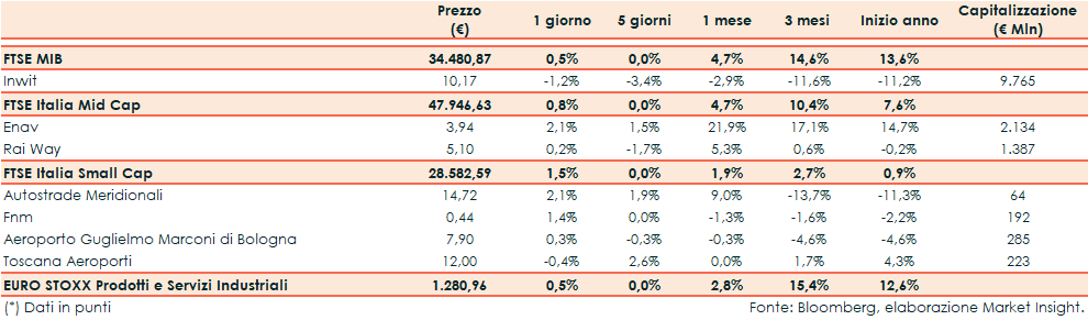 Infine, tra le Small, Autostrade Meridionali ha registrato un +2,1%, Fnm un +1,4%, Aeroporto Guglielmo Marconi di Bologna un +0,3% e Toscana Aeroporti un -0,4%.