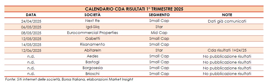 Si riporta di seguito il calendario dei Consigli di Amministrazione per l’approvazione dei conti del primo trimestre del 2025 delle società del comparto immobiliare quotate al mercato principale di Borsa Italiana (EXM).